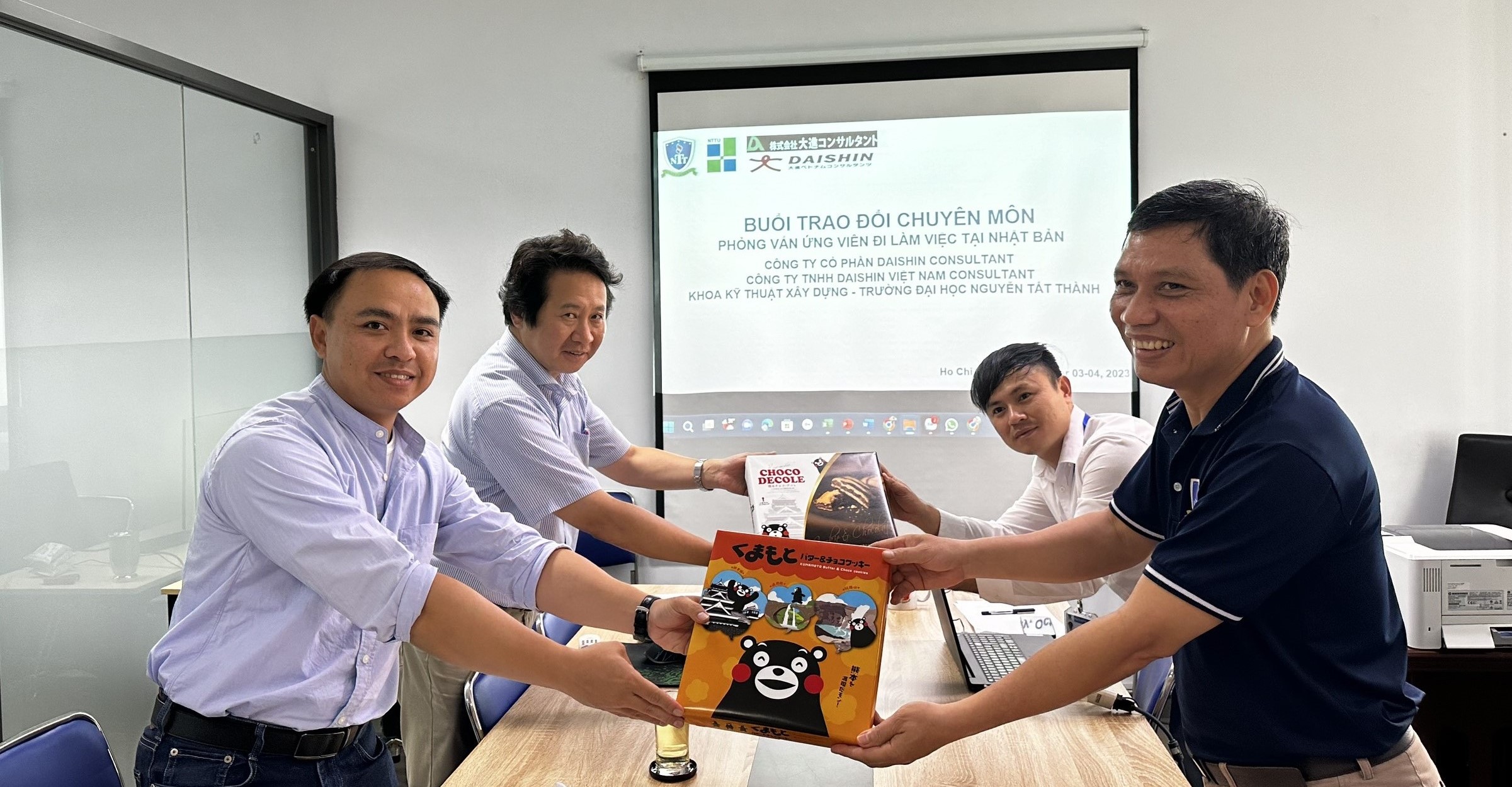 Đoàn do ông Ikebata Hideyuki–Chủ tịch Hội đồng quản trị kiêm Giám đốc điều hành Daishin dẫn đầu gồm có ông Shimomura Takeo –Giám đốc DVC, ông Yamashiro Yasufumi–Trưởng phòng Kế hoạch, và ông Châu Thái Thuận–Cán bộ Kỹ thuật Daishin đã đến thăm Khoa KTXD. Phía trường Đại học Nguyễn Tất Thành (NTTU), có PSG. TS. Vũ Trường Vũ – Trưởng Khoa KTXD, cùng các giảng viên của Khoa đã có buổi trao đổi chuyên môn và các thông tin hữu ích nhằm đẩy mạnh hơn nữa mối quan hệ tốt đẹp giữa Công ty với NTTU và Khoa KTXD. Trước đó vào tháng 06/2023, các bên đã ký Biên bản ghi nhớ – Memorandum of Understanding (MOU).
