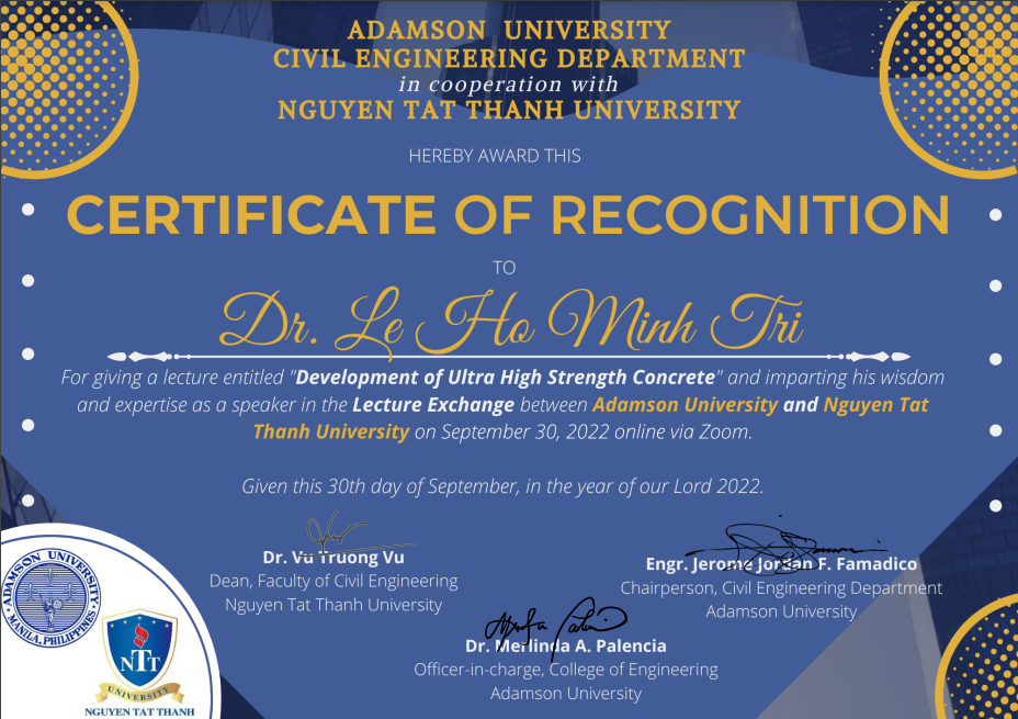 NTTU – Chiều ngày 30/09/2022, khoa Kỹ thuật xây dựng, trường Đại học Nguyễn Tất Thành đã tổ chức thành công buổi chuyên đề trực tuyến “Bê tông cường độ siêu cao” với sự đồng phối hợp của Khoa Kỹ thuật xây dựng trường Đại học Adamson, Philipines.