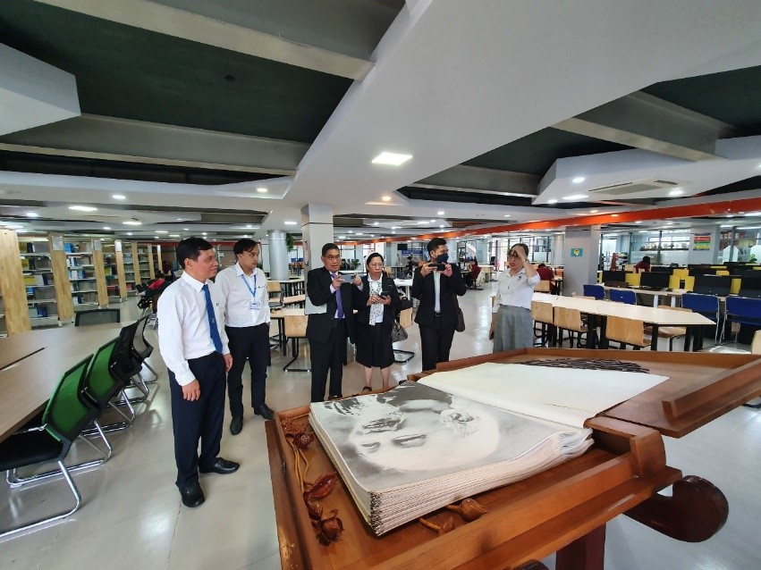 Đại diện thư viện giới thiệu cho trường Đại học Adamson về pho sách quý được lưu giữ tại đây