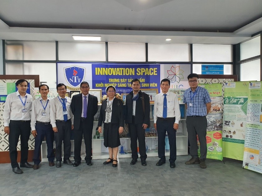 Đại diện 2 trường Đại học chụp ảnh lưu niệm tại khu trưng bày các sản phẩm khởi nghiệp và sáng chế của sinh viên NTTU