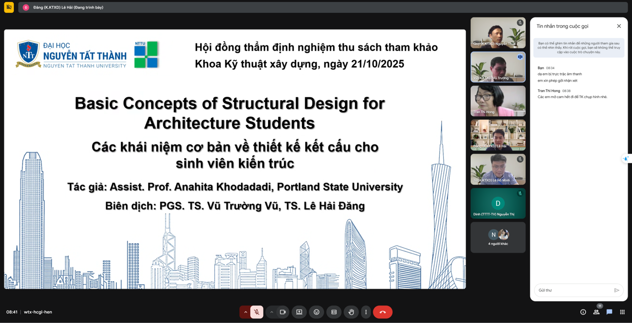 Ngày 21/10/2025, Trung tâm Thông tin – Thư viện và Phòng Quản lý Đào tạo, Trường Đại học Nguyễn Tất Thành (NTTU) đã tổ chức buổi nghiệm thu tài liệu dịch (sách tham khảo) do PGS.TS. Vũ Trường Vũ và TS. Lê Hải Đăng – Khoa Kỹ thuật xây dựng (KTXD) – biên dịch. Hội đồng nghiệm thu do PGS.TS. Trần Thị Hồng – Phó Hiệu trưởng NTTU – chủ trì.